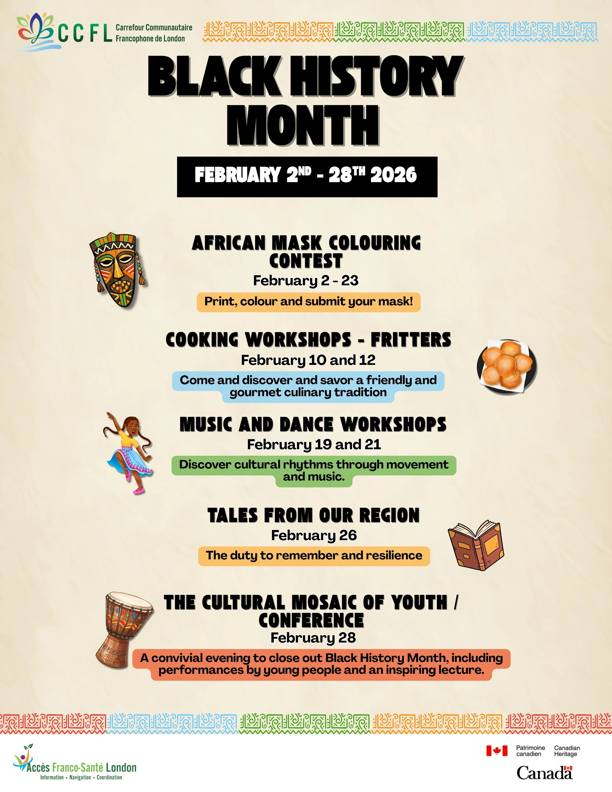 Take part in our coloring contest all month long! Download the African mask coloring page from our website or our social media, then let your creativity run free. Find the mask that matches your age group: 0–4 years, 5–10 years, and 11 years and up! Submit your artwork in person, by email, or on social media using the hashtag #CCFLEnCouleurs. An open contest for everyone!