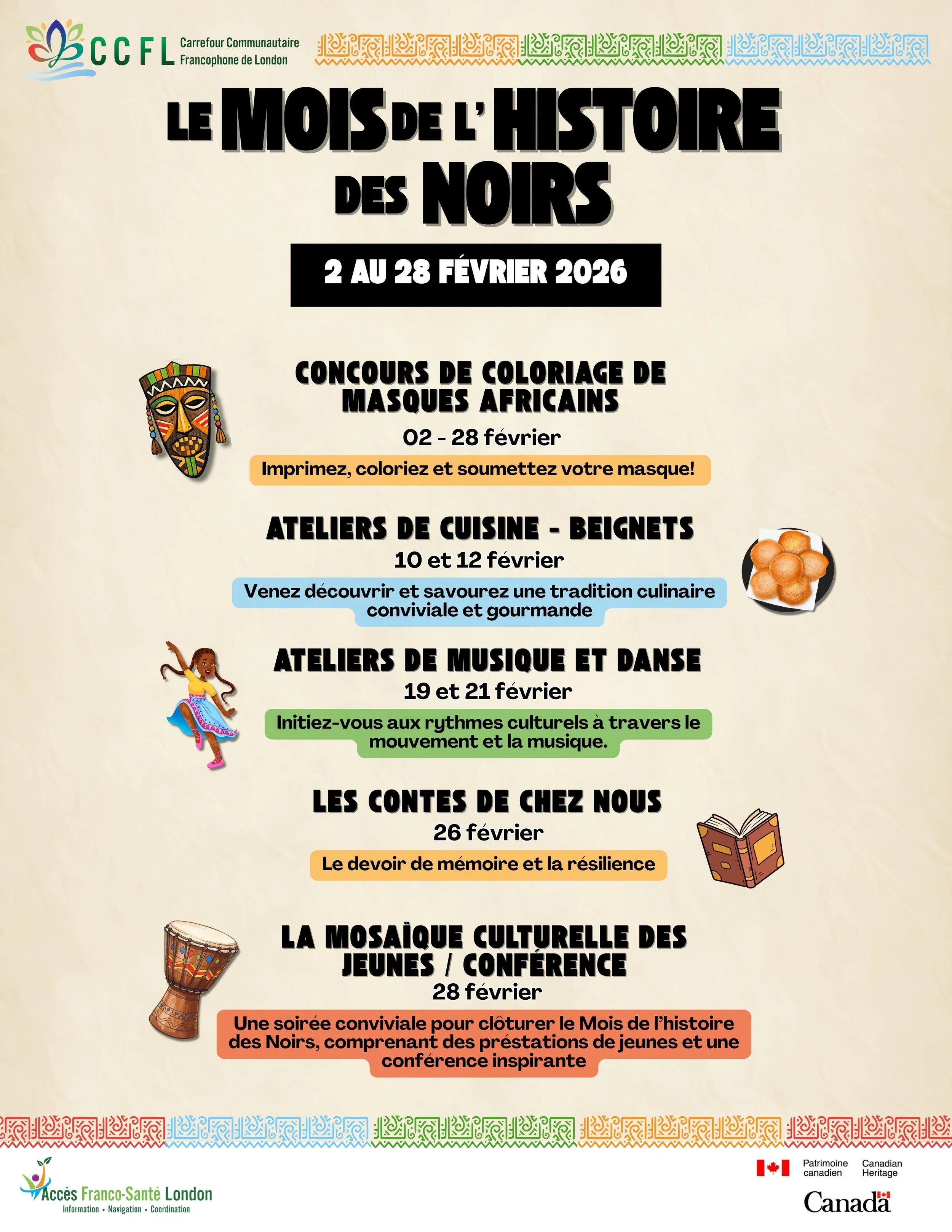 Participez à notre concours de coloriage tout au long du mois ! Téléchargez le dessin du masque africain sur notre site Web ou sur nos réseaux sociaux, puis laissez libre cours à votre créativité.Trouvez le masque correspondant à votre catégorie d’âge : 0 à 4 ans, 5 à 10 ans et 11 ans et plus ! Soumettez votre œuvre en personne, par courriel ou sur les réseaux sociaux avec le mot-clic #CCFLEnCouleurs.